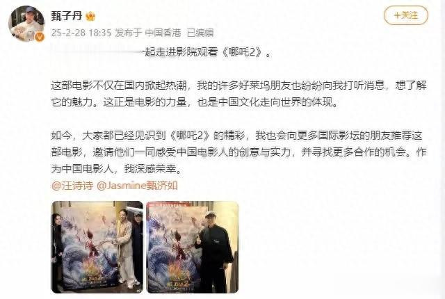 甄子丹带着老婆女儿去电影院看《哪吒2之魔童闹海》啦!并发文称:终于有时间和家人一起走进影院观看《哪吒2》。